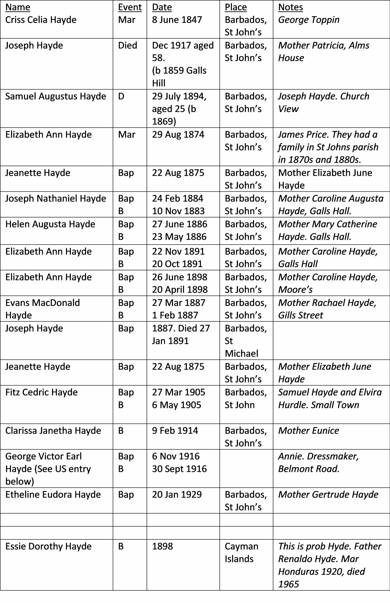 • Criss Celia Hayde m George Toppin 1847, St John parish. John Hayde was a witness.