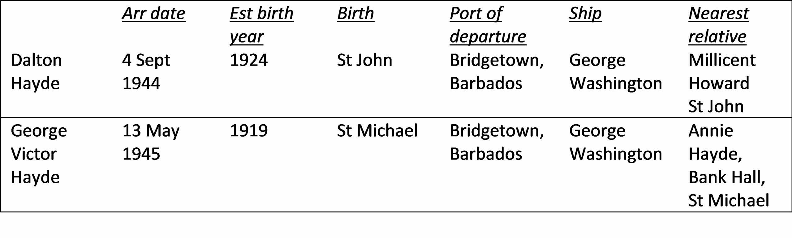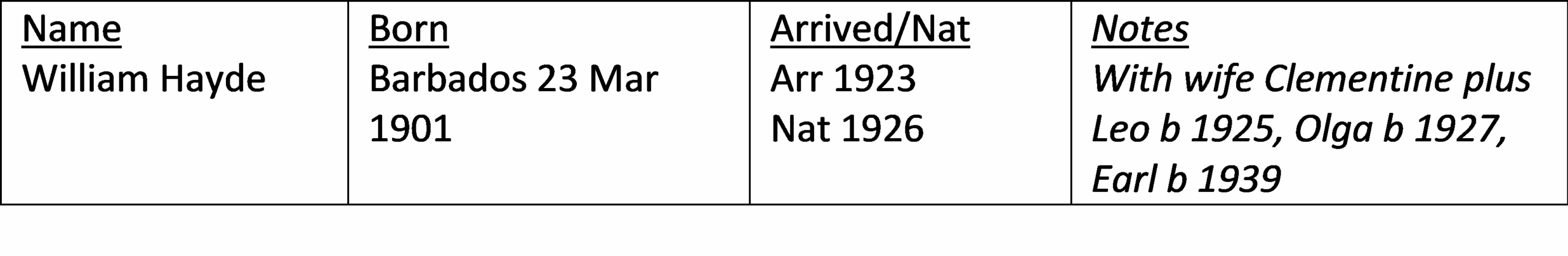 - Miss Ira Lenora Hayde b 3 August 1915 Sangre Grande, Trinidad . Naturalised 3 Sept 1969. She lived in London. Father was James Hayde b 3 Oct 1880, Sangre Grande, Trinidad.