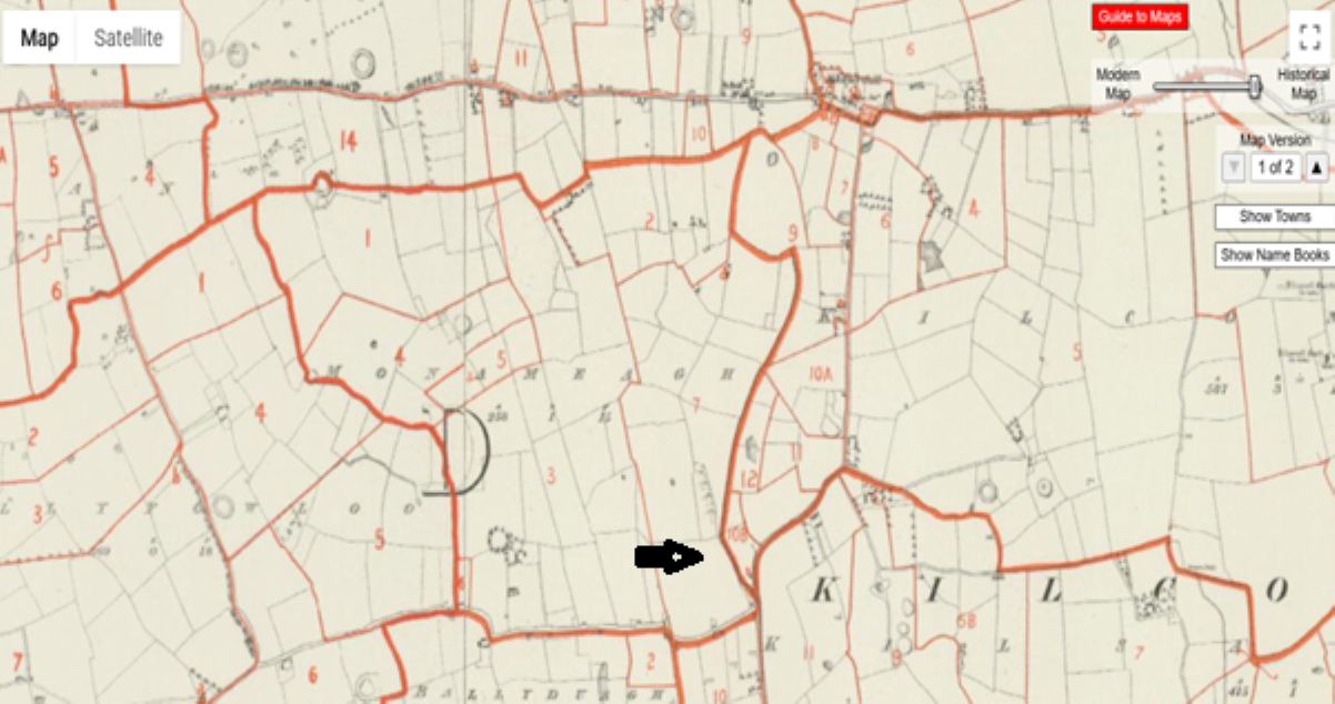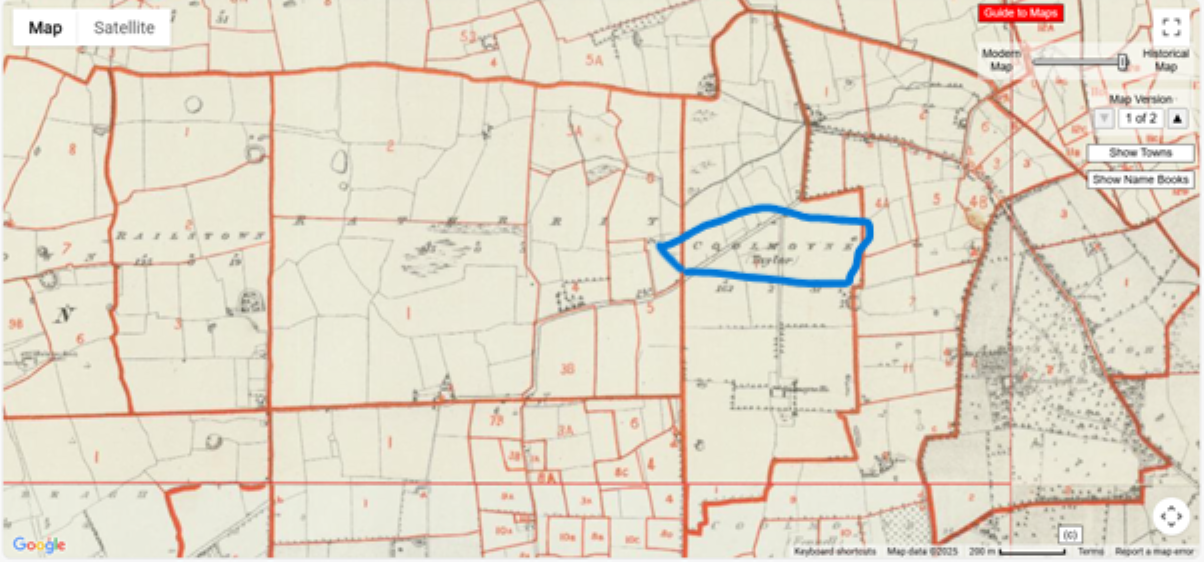 The 3 acre plot that Patrick farmed is not shown on the Griffiths map below. The 162 acre Taylor part of Coolmoyne is in the centre while the others parts are to the south and south west.
